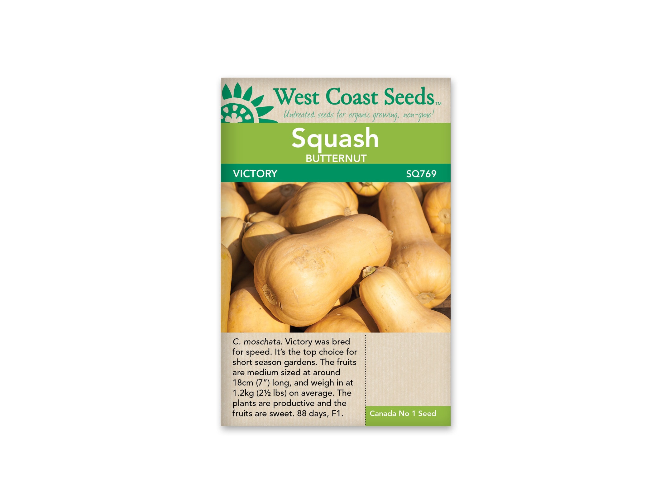 C. moschata. Victory Early Butternut squash was bred for speed, so it matures much earlier than the others. It’s the top choice for any short-season garden, producing before the onset of cold weather. The fruits are medium sized at around 18cm (7″) long, each weighing around 1.2kg (2.5 lbs). The flesh is fine and richly flavoured, without a lot of fibres. Avoid overhead watering with squash plants to delay the arrival of powdery mildew in late summer. Plant in rich, fertile soil in full sun and give each plant lots of room to grow in.