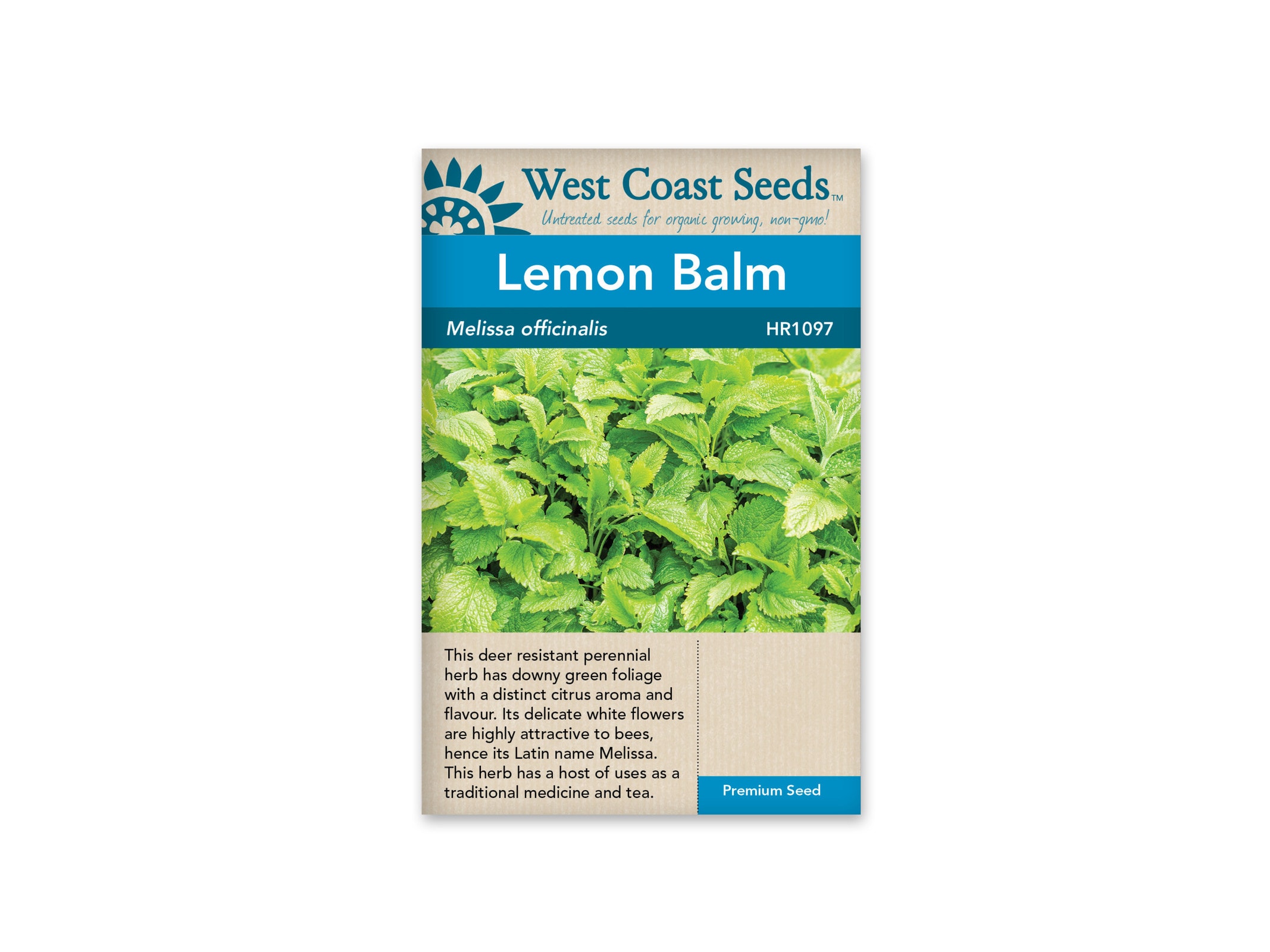 Melissa officinalis. Plant lemon balm seeds and rub the light green leaves for a sudden hit of lemon scent. Use in bouquets to lemon scent a room or brew an invigorating medicinal tea. Lemon Balm seeds produce a herbaceous perennial self-sows and bees love it. Plants grow vigorously so keep self-sown seedlings thinned out. The plants are deer resistant, so a useful filler plant for coastal areas. Chop back the plants by two thirds once the flowers have faded to prevent self sowing and to encourage the growth of new leaves. This plant belongs in every organic herb garden and has been cultivated for centuries as a medicinal plant.