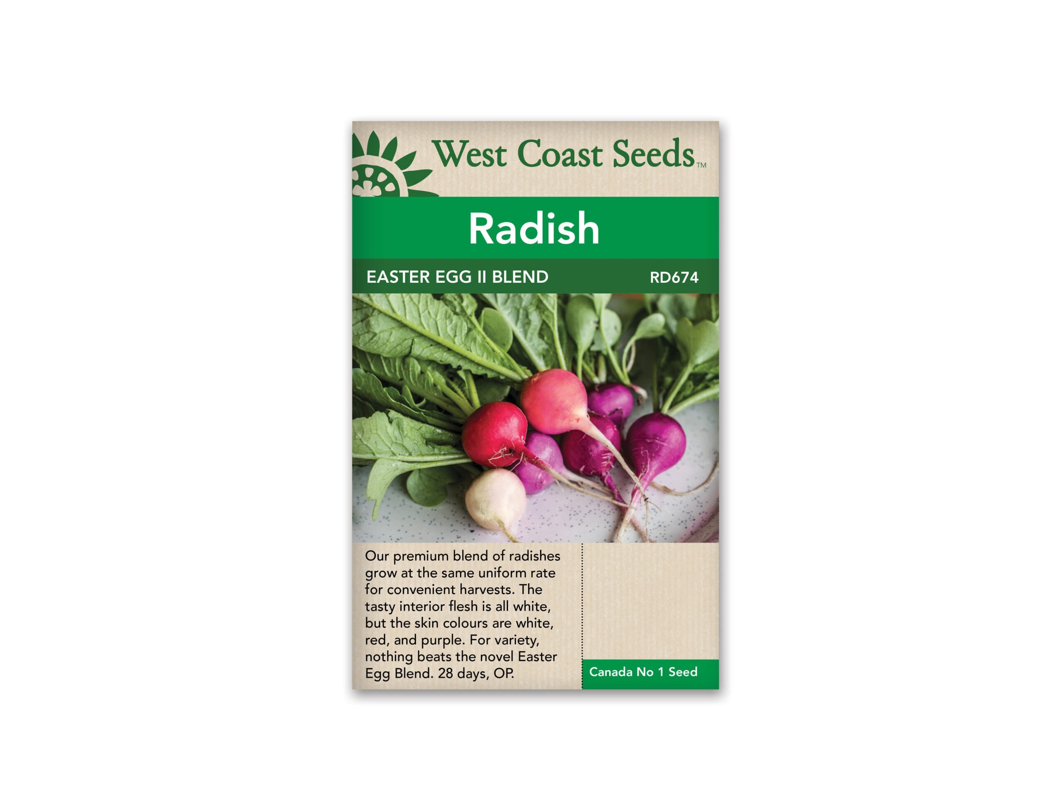 Easter Egg II radish seeds are a blend of six distinctly coloured radishes. The flesh is white and the roots can become relatively large without getting pithy. Look for white, rose pink, bubblegum pink, amethyst, mauve, scarlet and purple roots. The uniform roots are round, crisp, and flavourful, with tops that are good for bunching. Get the most out of your radish bed with this blend of diverse colours for spring and fall growing. Provide some frost protection, and you may be able to grow for winter harvests. Once radishes begin to bolt in response to warm soil in early summer, they should be pulled and composted. The process cannot be reversed, and a bolting radish is no good for eating.