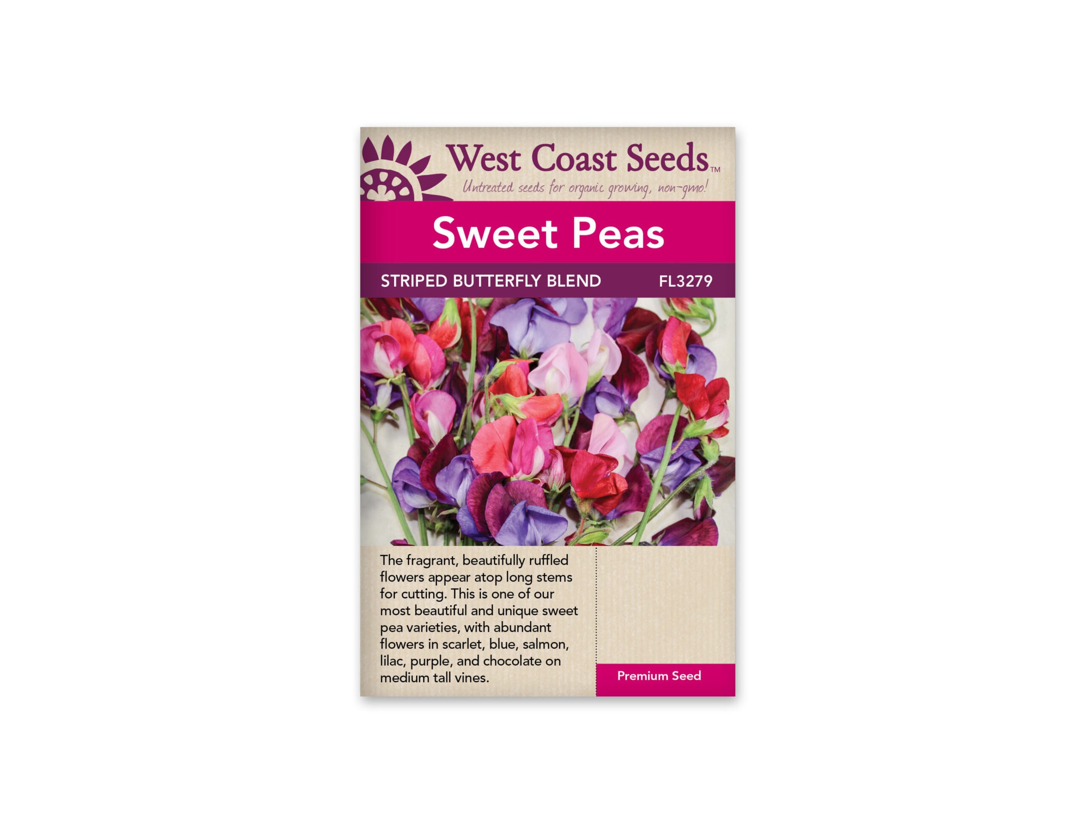 Lathyrus odoratus. Each creamy white petal is edged and mottled with a darker colour – scarlet, blue, salmon-rose, lilac, purple, and chocolate. Butterfly Blend sweet pea seeds are one of our most unique and beautiful varieties. This is a very nice climbing variety that works well with a trellis or plant net. Plants grow to a height of 120cm (48″) or more. Sweet peas grown for cut flowers work particularly well against a really solid support like a chain link fence or chicken wire stretched out on a frame of some kind. For the longest bloom period, be sure to remove all spent flowers as you see them.